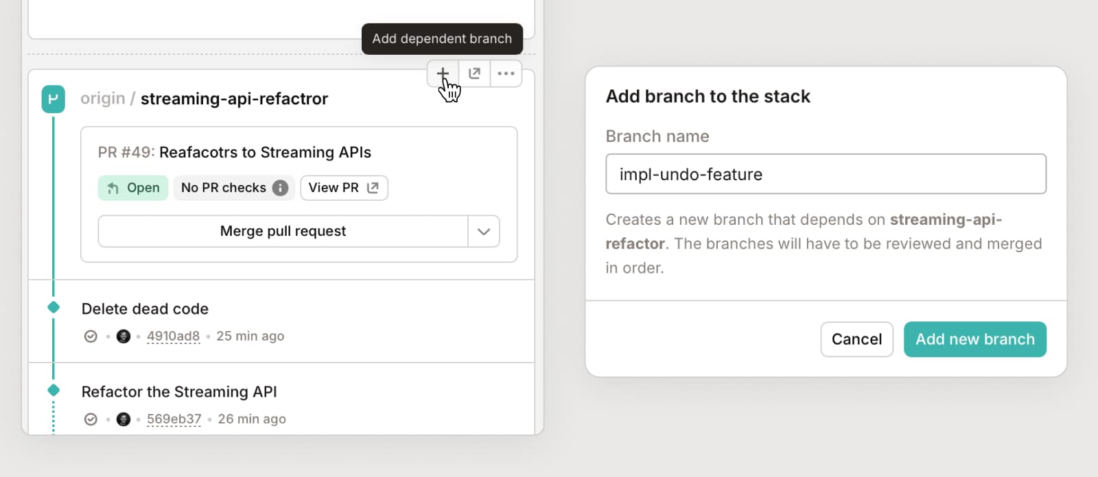 Using stacked branches (Pull Requests) can be helpful for shipping smaller changes more frequently.